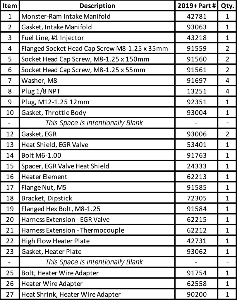Note: The billet heater plate, Item #22, is transitioning to a cast design (42731) with integrated fuel rail spacers. If your kit ships with this cast heater plate, the fuel rail spacers will not be included or used during installation.