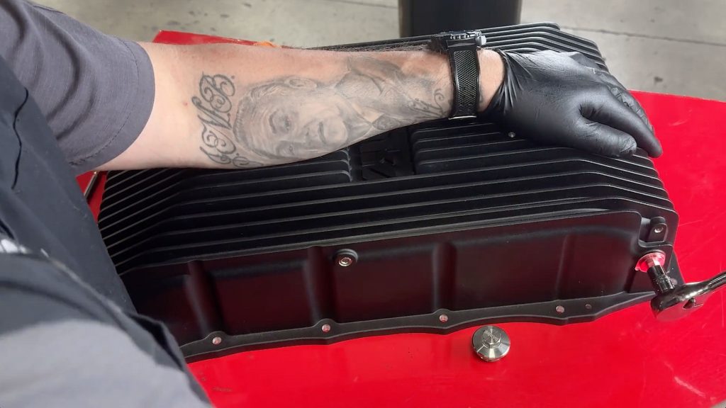 Be sure to support the pan as you remove the bolts to ease the removal and tilt the pan as you remove it to drain.