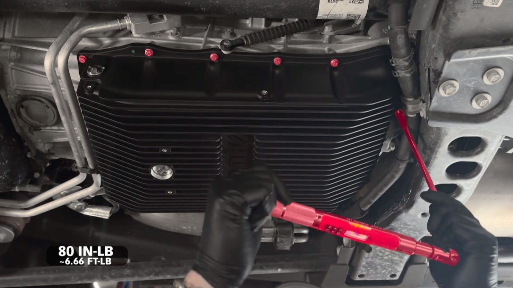 Thread back in the two bolts that hold the filter in place, and torque to 80 inch-pounds.