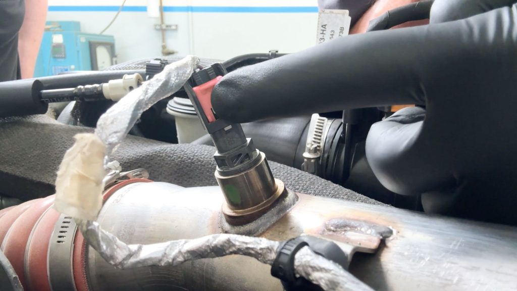 With a 15mm socket, secure the temperature sensor to the hot side boost tube.