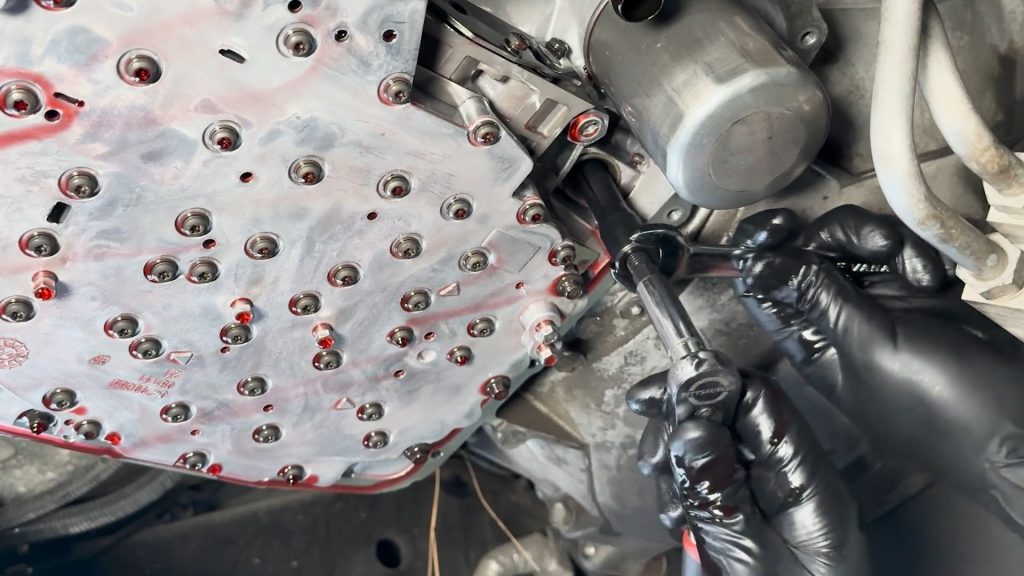 Snug down the 15 bolts that hold the transmission pan.
