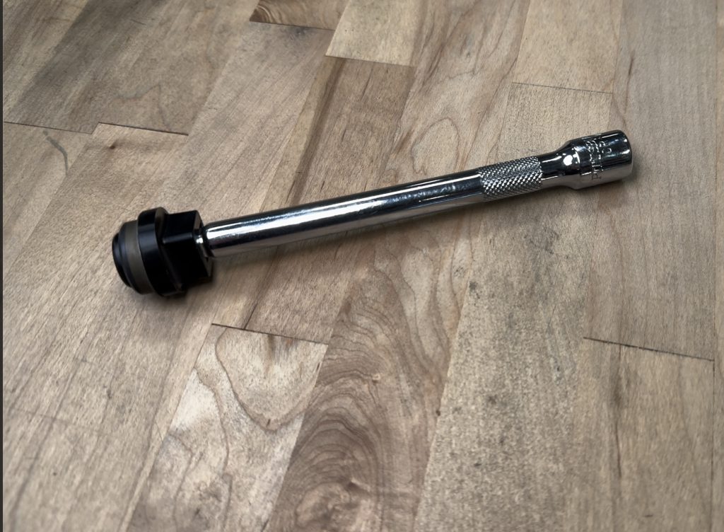 With the provided special tool, attach a 3/8″ extension to the end, and a new seal on top.