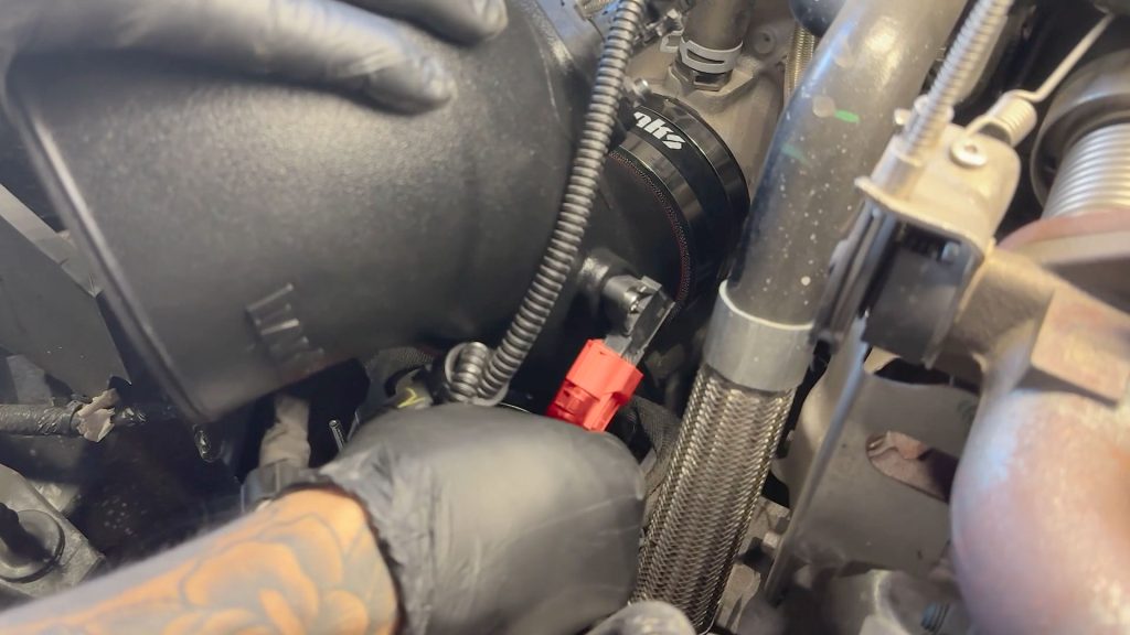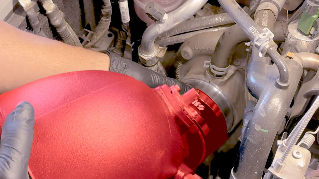 16. Slide the hose onto the Intake tube. The shorter side should face towards the tube, and the longer side towards the turbo inlet.