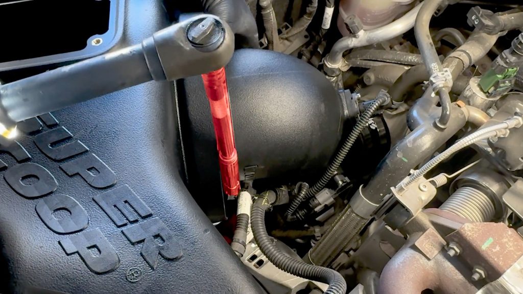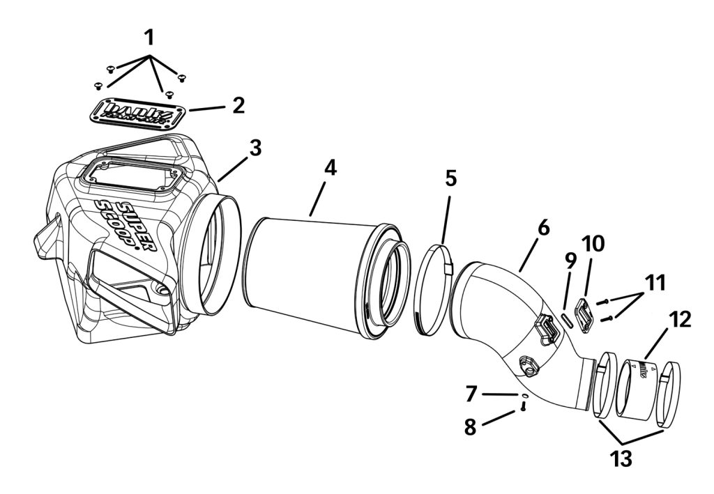 First, slide it over the Banks’ Super Scoop. Then, position it into place and reinstall the two bolts on either side of the scoop.