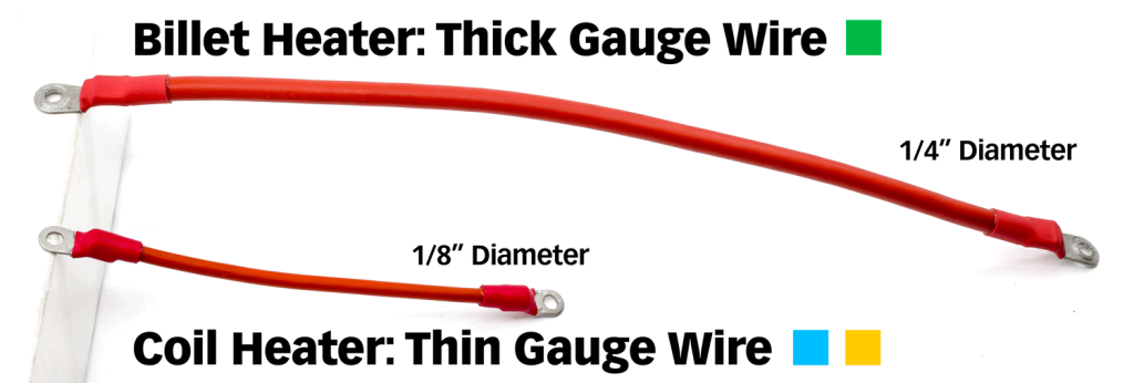 Only one coil heater should ever be connected to the end of a thin gauge wire, and no more than two coil heaters should ever be connected to the end of the thick gauge wire.