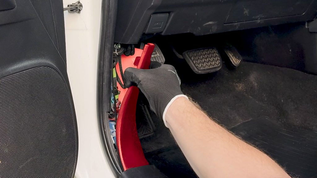 You don’t need to fully remove this panel; just pry it back slightly so you can run the OBD-II cable through to the other side.