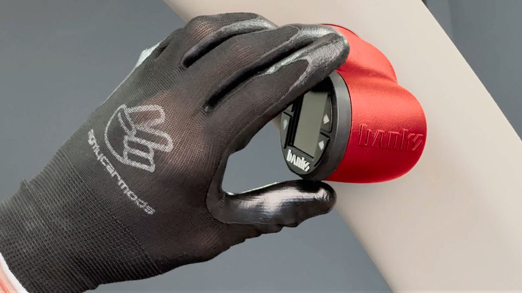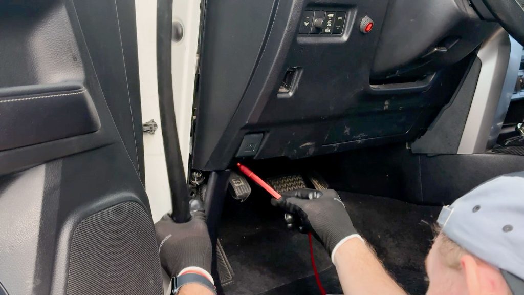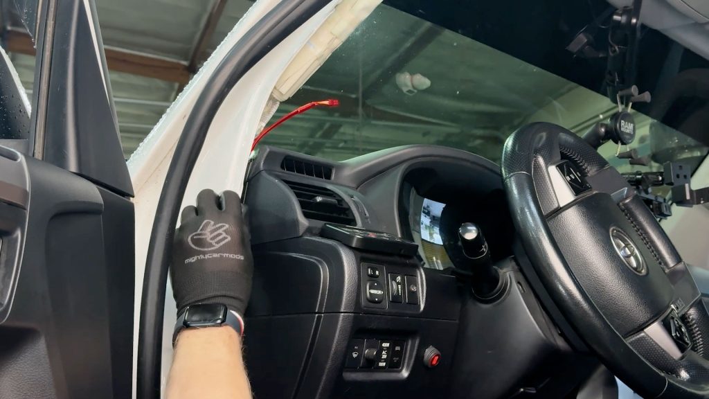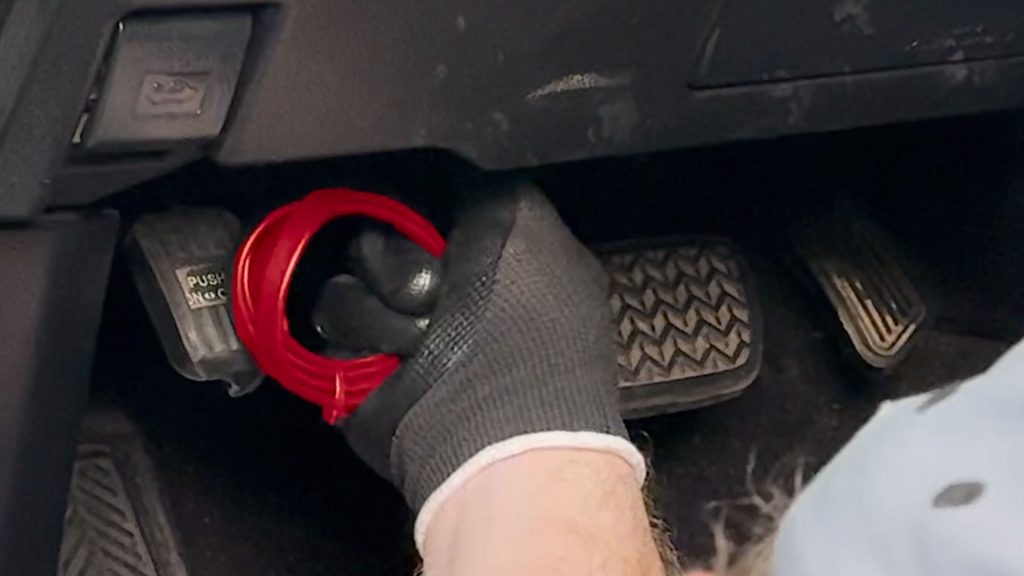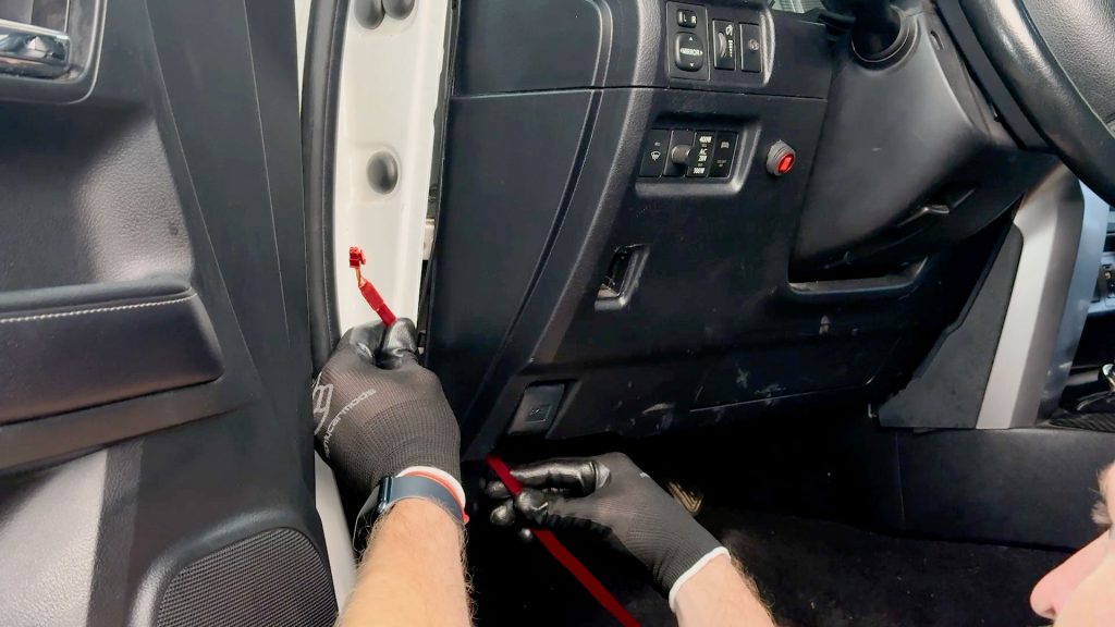 15. Thread the 4-pin side of the Banks OBD-II cable through towards the gap between the dashboard and the door frame.
