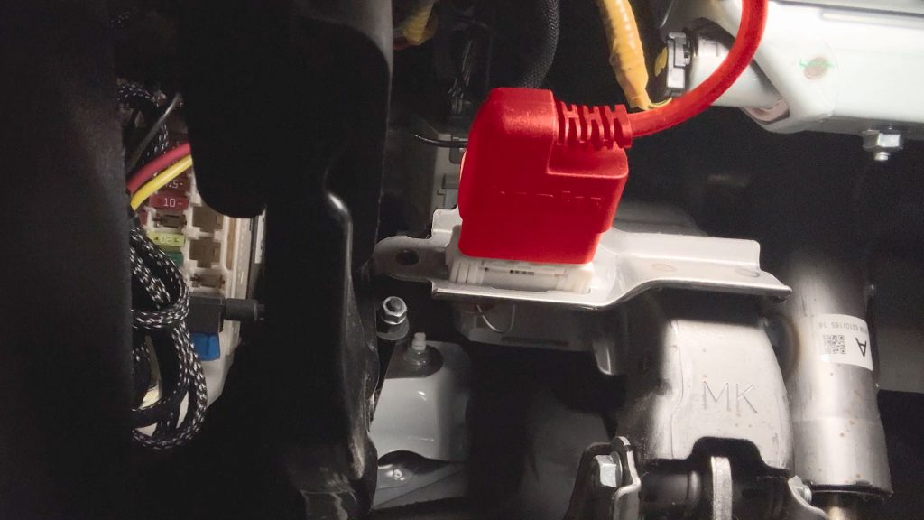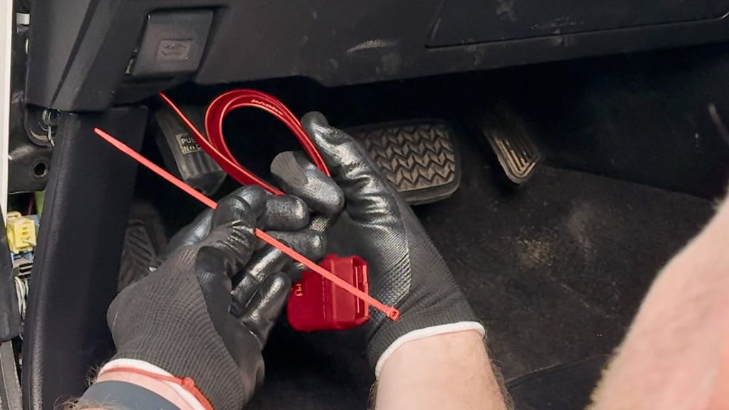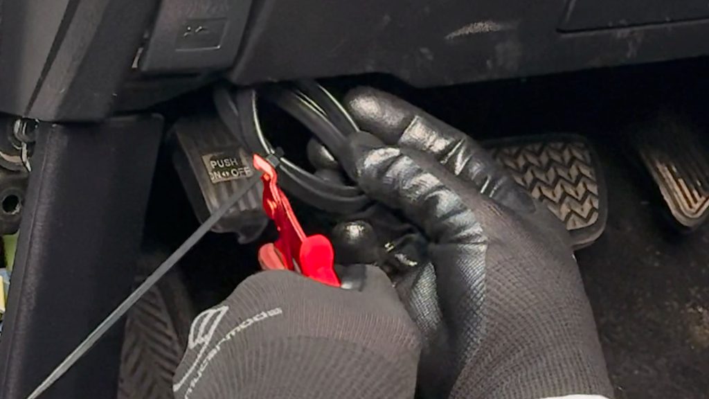 26. Back under the dashboard, coil up the extra length of OBD-II cable, and secure it with a zip-tie.