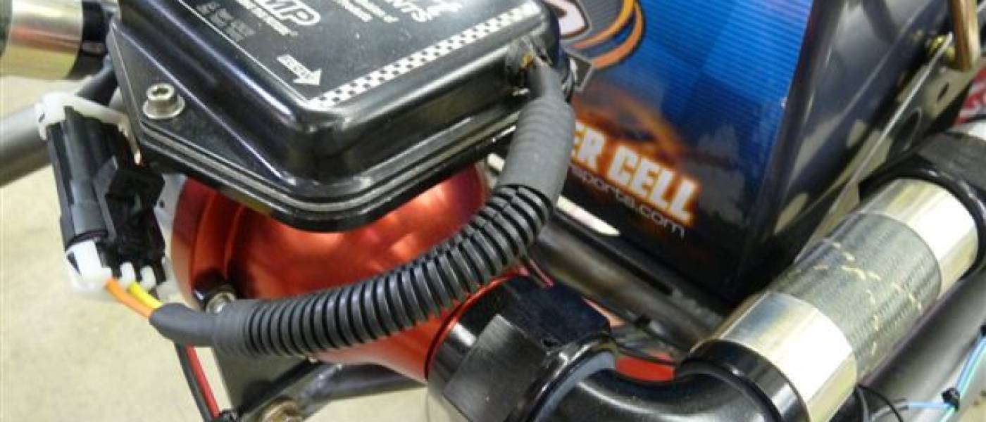 A small horizontal radiator topped by a shrouded electric cooling fan is used on the Banks Sidewinder Top Dragster. A very quiet, but very powerful, Stewart electric pump moves the coolant though the Sidewinder’s system. Hardly “exotic,” good old distilled water (from the local supermarket) with a bottle of Redline “Water Wetter” mixed in (just for good measure) is used as the coolant.