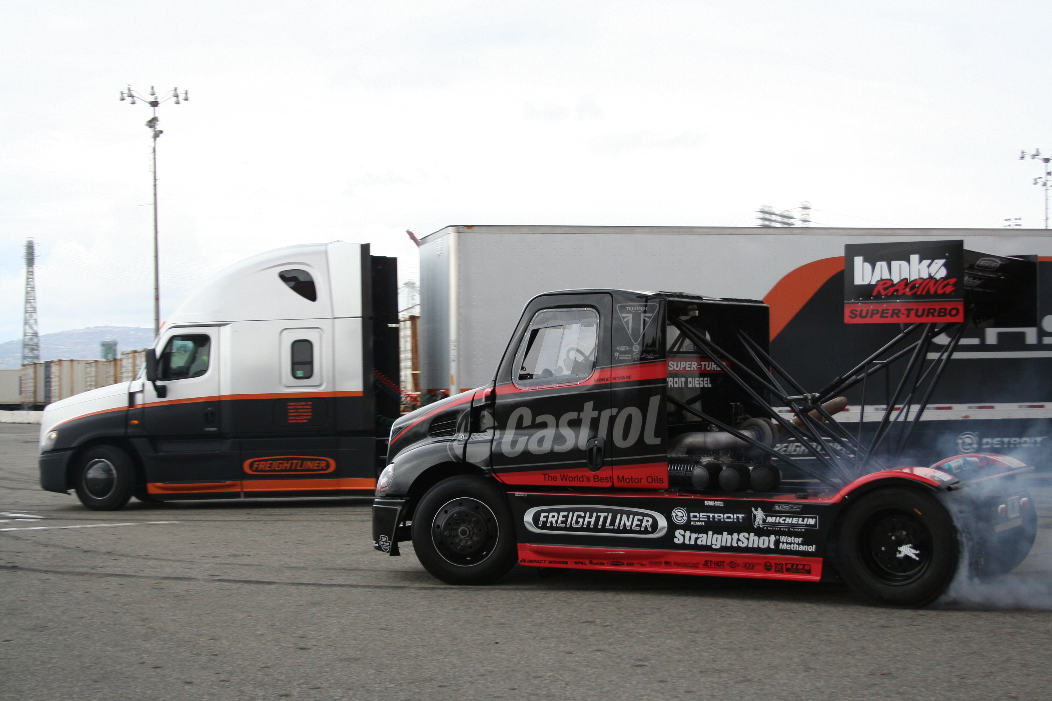 Mike Ryan’s Banks Super-Turbo Pikes Peak Freightliner is unlike any other truck in the universe. The truck is equipped with a 14.0L Detroit Diesel 60 series engine with a compression ratio of 15-1 and a fuel redline of 2700 RPM. The body is constructed entirely of fiberglass and carbon fiber, even still weighing in at just over 5 tons. Like any well balanced race vehicle, it is a mid-engine design. This truck truly tests the merit of each and every one of its systems. Good acceleration requires a responsive engine, high speed requires massive horsepower and cornering and handling require extreme braking capability.